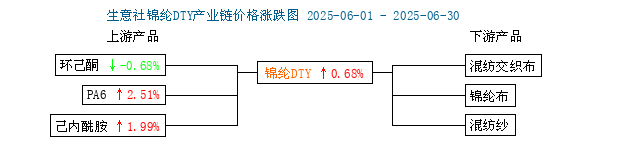 成本方面:2025年6月,己內(nèi)酰胺現(xiàn)貨市場(chǎng)價(jià)格偏強(qiáng)運(yùn)行,中石化高端己內(nèi)酰胺6月結(jié)算價(jià)格9720元,較5月結(jié)算價(jià)上漲250元/噸。錦綸PA6高速紡低粘半光市場(chǎng)價(jià)格呈現(xiàn)“跌-漲-跌”走勢(shì)。截止2025年6月27日,生意社己內(nèi)酰胺基準(zhǔn)價(jià)為9423元/噸,價(jià)格偏強(qiáng)上漲,月漲幅2.54%。月內(nèi)錦綸PA6切片高速紡切片市場(chǎng)價(jià)格小幅走高,錦綸PA6價(jià)格月漲幅2.51%,成本端支撐偏強(qiáng)為主。