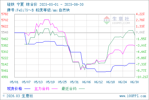 6月硅鐵先跌后漲,但整體價(jià)格仍偏弱運(yùn)行。受黑色系期貨行情全線下跌“拖累”,節(jié)后復(fù)市,硅鐵期貨行情大幅下行,盤面價(jià)格跌勢(shì)明顯,交割庫低價(jià)貨物流出明顯沖擊現(xiàn)貨市場(chǎng),拉低市場(chǎng)成交重心。6月中下旬隨著期貨行情震蕩上行,盤面價(jià)格逐步攀升,近期業(yè)內(nèi)情緒得以修復(fù),再加之部分原料價(jià)格穩(wěn)挺運(yùn)行成本端尚有一定支撐及其他利好信息刺激,硅鐵部分報(bào)價(jià)有所上調(diào),采購商壓價(jià)難度加大,市場(chǎng)低價(jià)貨源減少。不過,在新一輪鋼廠招標(biāo)進(jìn)展緩慢,行業(yè)傳統(tǒng)需求淡季深入,市場(chǎng)需求狀況仍是有待改善等均形成拖累的情況下,硅鐵價(jià)格上漲受阻,整體表現(xiàn)略顯僵持。據(jù)生意社商品行情分析系統(tǒng),6月30日硅鐵(牌號(hào):FeSi75~B;粒度等級(jí)/mm:自然塊)寧夏地區(qū)市場(chǎng)報(bào)價(jià)在5150-5250元/噸,市場(chǎng)均價(jià)5158元/噸,較月初跌2.64%。
