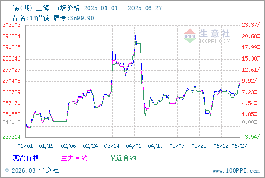 據(jù)生意社商品行情分析系統(tǒng)監(jiān)測(cè):本周(6.23-6.27)華東地區(qū)1#錫錠市場(chǎng)上漲,周初市場(chǎng)均價(jià)在262080元/噸,周末市場(chǎng)均價(jià)在269640元/噸,周漲幅2.88%。