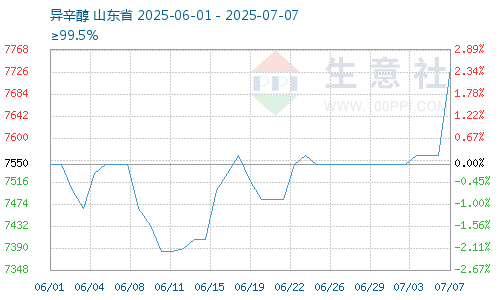 據生意社商品行情分析系統(tǒng),截止7月7日,異辛醇報價7733.33元/噸,較7月1日異辛醇價格7550元/噸震蕩上漲,漲幅2.43%。7月異辛醇價格震蕩上漲,7月異辛醇企業(yè)檢修較多,異辛醇設備開工率下降,異辛醇產量減少,異辛醇供給減少;下游增塑劑企業(yè)開工下降,增塑劑對異辛醇需求下降,供需雙弱,異辛醇價格震蕩上漲。
