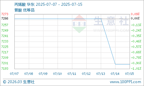 當(dāng)前丙烯酸市場(chǎng)延續(xù)下行趨勢(shì),截止7月15日,生意社丙烯酸基準(zhǔn)價(jià)為7200.00元/噸,與本月初(7266.67元/噸)相比,下降了1.01%。市場(chǎng)呈現(xiàn)供過(guò)于求態(tài)勢(shì),隨著供應(yīng)量持續(xù)增加,下游工廠多以消化合約貨源為主,整體觀望情緒濃厚,導(dǎo)致市場(chǎng)商談重心不斷震蕩下移。