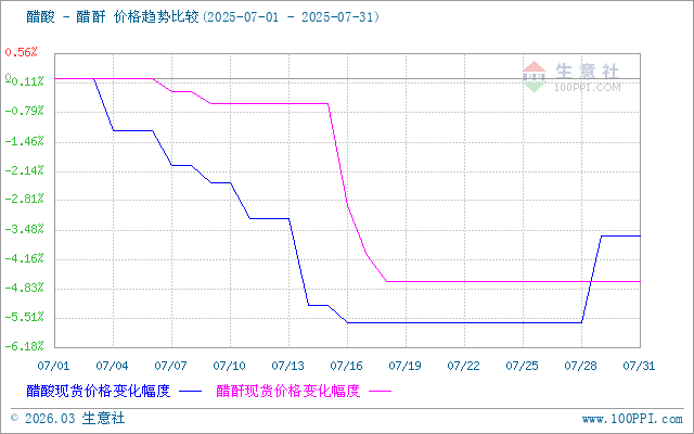 下游醋酐市場平穩(wěn)觀望,7月28日至31日醋酐出廠均價維持在4092.50元/噸。上游醋酸行情偏強(qiáng)整理,但市場采購氣氛一般,對醋酐支撐有限,下游入市按需為主,市場交投平穩(wěn)跟進(jìn),周期內(nèi)醋酐價格持穩(wěn)運行。