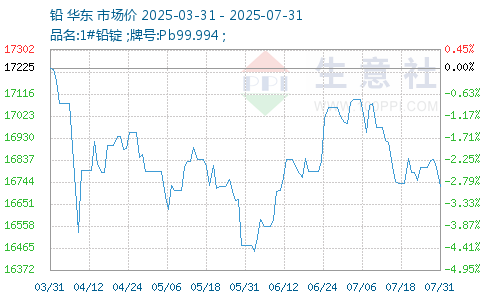 據(jù)生意社商品行情分析系統(tǒng):2025年7月國內(nèi)1#鉛錠市場小幅下跌,國內(nèi)市場均價月初在16995元/噸,月末16725元/噸,月跌幅1.59%。