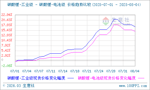據(jù)生意社商品行情分析系統(tǒng)顯示:近期碳酸鋰價(jià)格沖高回落,截至8月4日,國(guó)內(nèi)電池級(jí)碳酸鋰生意社基準(zhǔn)價(jià)70833元/噸,較近期高點(diǎn)72833元/噸(7月30日)下跌2.75%,較去年同期91000元/噸下跌22.16%;國(guó)內(nèi)工業(yè)級(jí)碳酸鋰生意社基準(zhǔn)價(jià)69666元/噸,較近期高點(diǎn)71866元/噸(7月30日)下跌3.06%,較去年同期88400元/噸下跌21.19%。