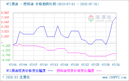 7月原油市場行情震蕩上漲,7月中上旬OPEC+發(fā)布年度世界石油展望下調能源需求預期導致油價承壓,加之中東地緣局勢影響,美國加大對于俄羅斯的制裁力度,并且美國將從8月1日起對歐盟和墨西哥大部分進口商品征收30%關稅,國際原油行情震蕩;7月下旬美國與歐盟達成新的貿易協(xié)議,美國可能對俄羅斯采取新制裁,且美國關稅憂慮持續(xù)減弱,原油價格持續(xù)上漲。