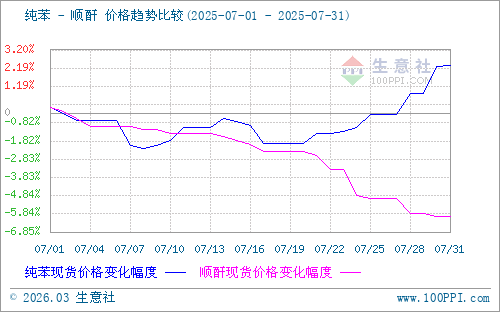上游方面:7月山東地區(qū)純苯市場價格震蕩上漲。上旬市場價格震蕩下跌,中旬市場價格先漲后跌,下旬市場價格大幅上漲。7月1日價格在5942元/噸;7月30日價格在6078.67元/噸,較月初上漲2.3%。