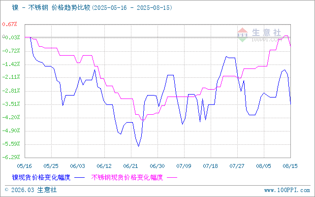 據(jù)生意社價差分析工具顯示,鎳和不銹鋼價格基本相似,近期都是先漲的跌。