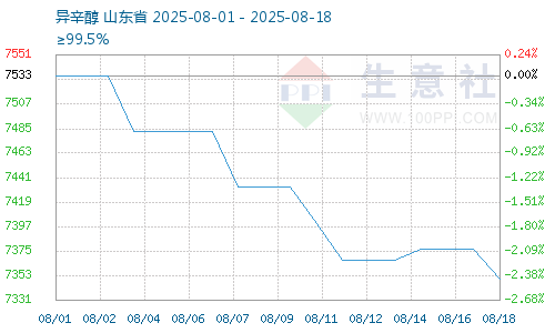 據(jù)生意社商品行情分析系統(tǒng),截止8月18日異辛醇報(bào)價(jià)7350元/噸,較8月10日異辛醇價(jià)格7433.33元/噸震蕩下跌,跌幅1.12%。本周異辛醇價(jià)格震蕩下跌,增塑劑成本下降,DOP下跌壓力加大。