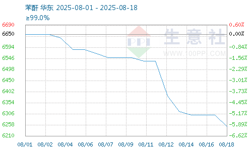 據(jù)生意社商品行情分析系統(tǒng),截止8月18日鄰法苯酐報(bào)價(jià)為6250元/噸,較8月10日苯酐價(jià)格6550元/噸震蕩下跌,跌幅4.58%。8月18日鄰苯報(bào)價(jià)6400元/噸,較8月10日鄰苯價(jià)格6600元/噸下跌3.03%,苯酐成本下降,苯酐設(shè)備開工率小幅下降至6成左右,苯酐供給充足依舊,本周苯酐價(jià)格震蕩下跌。成本下降,本周增塑劑DOP價(jià)格下跌。