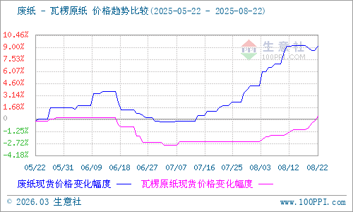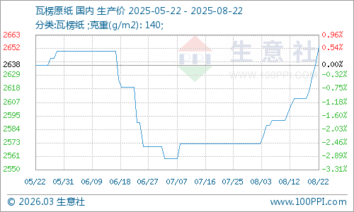 據(jù)生意社商品行情分析系統(tǒng)監(jiān)測:本周瓦楞紙價格上漲勢頭不斷擴大,多地區(qū)價格走高。2025年8月22日瓦楞原紙140g出廠價格均價為2654元/噸,與8月17日均價相比上漲了1.69%。