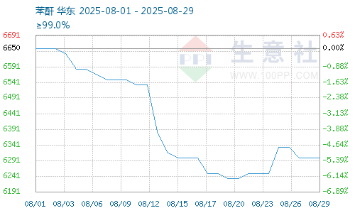 據(jù)生意社商品行情分析系統(tǒng),截止8月29日鄰法苯酐報價為6300元/噸,較8月1日苯酐價格6650元/噸震蕩下跌,跌幅5.26%。8月鄰苯價格震蕩下跌,工業(yè)萘價格觸底反彈,苯酐成本支撐較大,8月苯酐設(shè)備負荷低位盤整,苯酐企業(yè)開工率6成左右,苯酐供給減少,下游增塑劑行情震蕩下跌,增塑劑企業(yè)設(shè)備開工負荷高位盤整,苯酐需求支撐仍存。供給減少成本下降,8月苯酐價格觸底反彈。