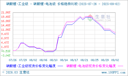 據(jù)生意社商品行情分析系統(tǒng)顯示:近期碳酸鋰價(jià)格劇烈波動(dòng),截至9月2日,電池級(jí)碳酸鋰生意社基準(zhǔn)價(jià)77233元/噸,較上周二下降7.76%,環(huán)比上漲8.27%,同下降6.72%;工業(yè)級(jí)碳酸鋰生意社基準(zhǔn)價(jià)75500元/噸,較上周二下降8.11%, 環(huán)比上漲7.4%, 同比下降6.09%。