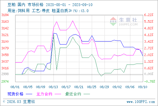 期貨:進(jìn)入9月,美豆陸續(xù)步入收割季,出口需求依舊有所擔(dān)憂,外盤(pán)美豆期價(jià)行情走弱,打壓國(guó)內(nèi)豆類(lèi)期貨行情上揚(yáng)。國(guó)內(nèi)豆粕期貨行情不佳,現(xiàn)貨行情整體弱勢(shì)下跌。截止9月10日,連豆粕主力合約收3066元/噸,較9月初下跌0.39%。期貨行情疲軟,豆粕行情不斷走低。