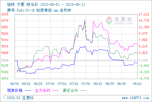 雖有部分消息對(duì)市場(chǎng)行情形成擾動(dòng),但近期硅鐵期貨行情基本維持區(qū)間震蕩運(yùn)行,盤面價(jià)格調(diào)整幅度不大,而現(xiàn)貨行情也是窄幅波動(dòng),市場(chǎng)報(bào)價(jià)未有明顯調(diào)整,多數(shù)觀望氛圍較濃。據(jù)生意社商品行情分析系統(tǒng),9月12日硅鐵(牌號(hào):FeSi75~B;粒度等級(jí)/mm:自然塊)寧夏地區(qū)市場(chǎng)報(bào)價(jià)在5250-5350/噸,市場(chǎng)均價(jià)5245元/噸,較周一漲0.60%。