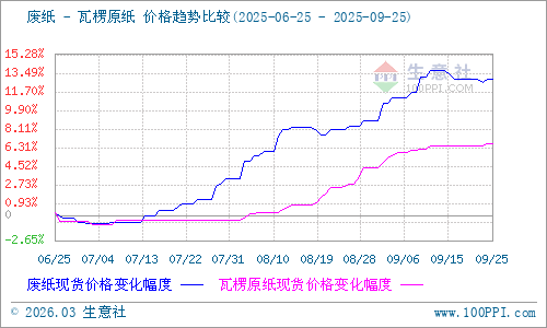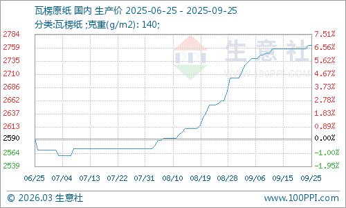 據(jù)生意社商品行情分析系統(tǒng)監(jiān)測:本周瓦楞紙價格大穩(wěn)小動,稍有上浮。2025年9月25日瓦楞原紙140g出廠價格均價為2764元/噸,與9月21日均價相比上漲了0.22%。