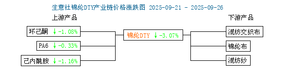 本周(2025年9月22—26日),下游需求疲態(tài)不改,終端市場需求未有明顯改善,下游工廠多維持剛需采購,需求自下而上傳導(dǎo)不暢,導(dǎo)致錦綸長絲廠家出貨持續(xù)清淡,庫存壓力不斷增加;上游成本端支撐不足,錦綸PA6切片市場走勢偏弱,場內(nèi)供應(yīng)量寬裕,供應(yīng)端表現(xiàn)一般,錦綸纖維市場價(jià)格弱勢下滑。