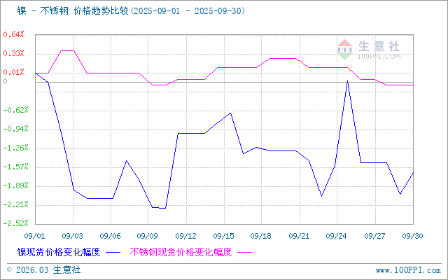 不銹鋼需求低迷:作為鎳的主要消費領域,不銹鋼市場成交氛圍一般,終端按需采購,月內部分不銹鋼廠因產線超低排放改造及檢修影響產量,但整體不銹鋼排產量仍處于相對高位,對鎳價保持剛需支撐。9月30日不銹鋼基準價報13,055元/噸,月內下跌0.19%。
