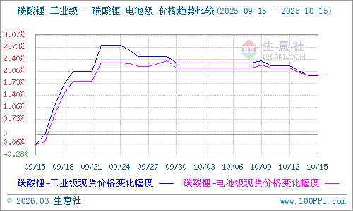 據(jù)生意社商品行情分析系統(tǒng)顯示:近期國內(nèi)碳酸鋰呈現(xiàn)窄幅震蕩趨勢,截至10月15日,國內(nèi)電池級碳酸鋰現(xiàn)貨生意社基準價73016元/噸,環(huán)比上漲1.95%,同比下跌10.3%;國內(nèi)工業(yè)級碳酸鋰現(xiàn)貨生意社基準價71166元/噸,環(huán)比上漲1.93%,同比下跌9.69%。