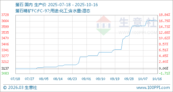 原料端:國內(nèi)螢石市場價(jià)格暫穩(wěn),成本端仍高位支撐。截止10月16日,生意社螢石基準(zhǔn)價(jià)為3675.00元/噸,與本月初(3610.00元/噸)相比,上漲了1.80%。螢石價(jià)格的持續(xù)高位使氫氟酸成本面支撐強(qiáng)勁,氫氟酸行情持穩(wěn)運(yùn)行。