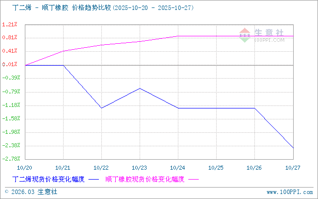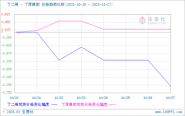 據(jù)生意社商品行情分析系統(tǒng),本周期國(guó)內(nèi)丁二烯市場(chǎng)震蕩下行。2025年至10月20日至10月27日丁二烯自8440元/噸下調(diào)至8233.33元/噸,跌2.45%。本周期國(guó)內(nèi)丁二烯市場(chǎng)整體偏弱運(yùn)行,下游合成橡膠市場(chǎng)入市積極性偏低,對(duì)原料丁二烯的采購(gòu)意向偏淡,市場(chǎng)實(shí)際成交表現(xiàn)不佳,缺少需求支撐,本周期丁二烯市場(chǎng)整體偏弱運(yùn)行。