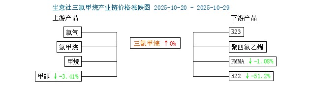 近日甲醇價(jià)格下行、液氯價(jià)格走高,三氯甲烷成本面仍存支撐。據(jù)生意社商品行情分析系統(tǒng)顯示,截至10月29日甲醇現(xiàn)貨價(jià)格在2212元/噸,較20日的2290元/噸下跌了3.41%。截至10月29日山東地區(qū)液氯槽車承兌價(jià)格在250元/噸附近,較前期走高50元/噸附近。