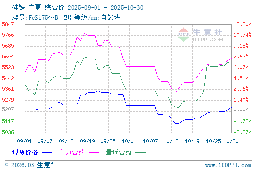 10月硅鐵現(xiàn)貨價格先跌后漲。節(jié)后復市,市場需求不及之前預期,及假期間部分硅廠有庫存累積均對整體行情形成壓制,業(yè)內(nèi)部分信心稍顯不足,實際成交價格下調(diào)。十月中旬鋼招啟動,市場需求稍有釋放,再加之行業(yè)傳統(tǒng)需求旺季未過及蘭炭價格傳出上調(diào)消息使其支撐力度增強,市場報價紛紛上調(diào)。據(jù)生意社商品行情分析系統(tǒng),10月30日硅鐵(牌號:FeSi75~B;粒度等級/mm:自然塊)寧夏地區(qū)市場報價在5200-5350元/噸,市場均價5227元/噸,較節(jié)前跌0.27%。