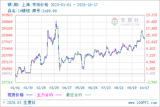 據(jù)生意社商品行情分析系統(tǒng)監(jiān)測(cè):本周(10.13-10.17)華東地區(qū)1#錫錠市場(chǎng)小幅下跌,周初市場(chǎng)均價(jià)在282820元/噸,周末市場(chǎng)均價(jià)在281160元/噸,周跌幅0.59%。