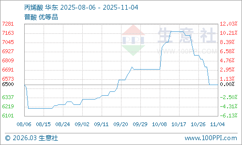 價(jià)格層面:截止11月4日,生意社丙烯酸基準(zhǔn)價(jià)為6500.00元/噸,與本月初持平。