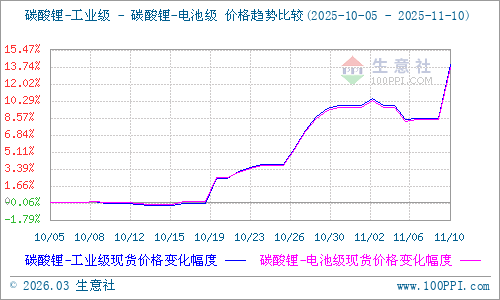 據(jù)生意社商品行情分析系統(tǒng)顯示:11月10日,碳酸鋰價(jià)格大幅上漲,電池級(jí)碳酸鋰生意社基準(zhǔn)價(jià)83200元/噸,較前一日上漲4.92%,工業(yè)級(jí)碳酸鋰生意社基準(zhǔn)價(jià)81433元/噸,較前一日上漲5.03%。