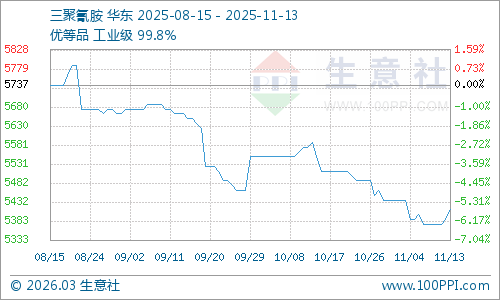 本周,三聚氰胺市場整體呈現(xiàn)穩(wěn)中偏強(qiáng)的態(tài)勢,截止11月13日,生意社三聚氰胺基準(zhǔn)價為5387.50元/噸,與上周(5375.50元/噸)相比,上漲了0.68%。