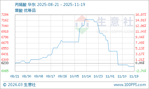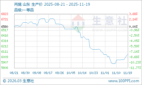 主要原料丙烯的價格近期出現(xiàn)小幅上漲,這直接推高了丙烯酸的生產(chǎn)成本。在這種情況下,生產(chǎn)商的利潤空間被壓縮,降價銷售的意愿極低。堅挺的丙烯價格,為丙烯酸市場構(gòu)筑了一個堅實的底部,有效降低了價格大幅下跌的空間。截止11月19日,生意社丙烯基準(zhǔn)價為6038.25元/噸,與本月初(6058.25元/噸)相比,下降了0.33%。