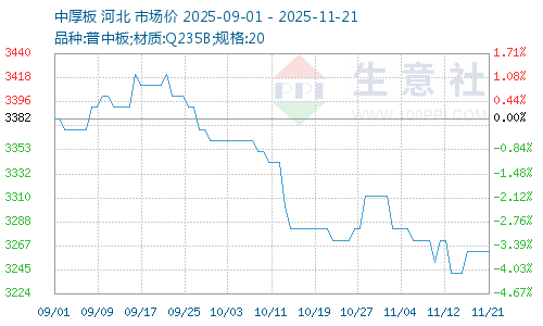 本周中厚板市場整體價格弱勢運行。據(jù)生意社商品行情分析系統(tǒng),普中板(材質(zhì):Q235B;規(guī)格:20)11月21日價格為3262元/噸,較周一持平。