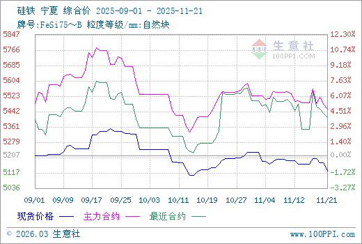 周二開始,硅鐵期貨行情一路震蕩下行,盤面價格逐步松動,部分采購商盤面采購積極性有增對工廠出貨造成不利影響,再加之實際需求跟進仍是較為緩慢,現各大鋼廠進行硅鐵招標采購已結束,零售端需求狀況較為一般,12月硅鐵招標尚未全面啟動;另外,部分地區(qū)鋼廠減停產消息傳出繼續(xù)對硅鐵等原料市場造成不利影響,目前整體供應依然相對寬松,硅鐵行情繼續(xù)承壓運行,部分實際成交價格有所調整。據生意社商品行情分析系統(tǒng),11月21日硅鐵(牌號:FeSi75~B;粒度等級/mm:自然塊)寧夏地區(qū)市場報價在5100-5250/噸,市場均價5128元/噸,較周一跌1.24%。