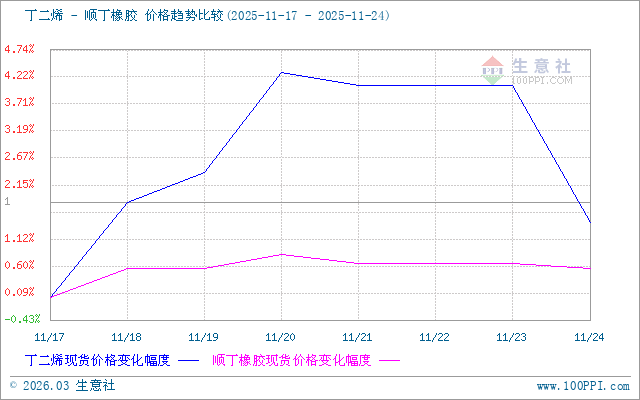 據(jù)生意社商品行情分析系統(tǒng),本周期國內(nèi)丁二烯市場震蕩上行。2025年至11月17日至11月24日丁二烯自6966.67元/噸上調(diào)至7066.67元/噸,漲1.44%。本周期國內(nèi)丁二烯市場先漲后跌整體上行,近期丁二烯市場走勢偏強,供應(yīng)面來看近期供應(yīng)整體依舊偏寬松,隨著價格走高后下游入市積極性明顯減弱,加上合成橡膠市場近期走勢偏弱,丁二烯市場走勢轉(zhuǎn)弱。