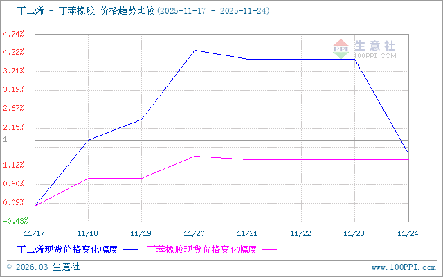 生意社丁二烯-順丁橡膠(下游產(chǎn)品)價格走勢比較圖: