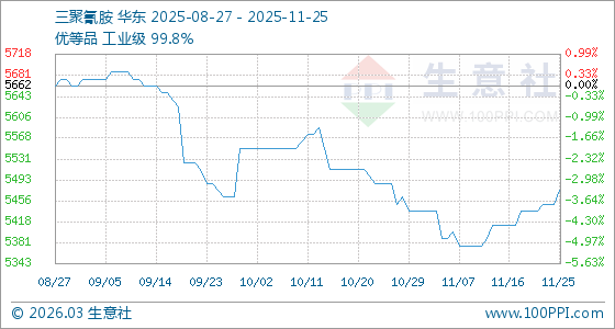 本周,國內(nèi)三聚氰胺市場小幅上漲的態(tài)勢。截止11月25日,生意社三聚氰胺基準(zhǔn)價(jià)為5450.00元/噸,與本月初(5437.50元/噸)相比,上漲了0.23%。從區(qū)域來看,河北地區(qū)表現(xiàn)最為強(qiáng)勁。