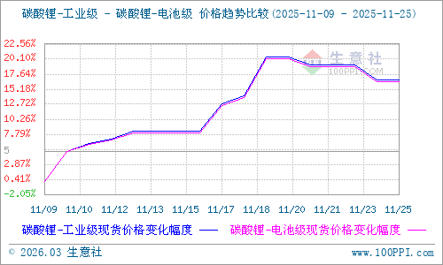據(jù)生意社商品行情分析系統(tǒng)顯示,近期碳酸鋰價格呈現(xiàn)劇烈波動態(tài)勢,截至11月25 日,國內(nèi)電池級碳酸鋰生意社基準價92266元/噸,較周內(nèi)高位(11月19日)下跌3.15%,環(huán)比上漲21.56%,同比上漲14.19%;國內(nèi)工業(yè)級碳酸鋰生意社基準價90433元/噸,環(huán)比上漲21.99%,同比上漲15.64%。