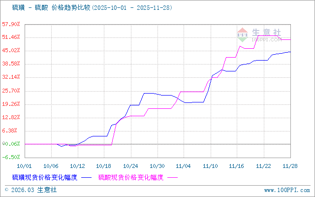 自10月中旬以來國內(nèi)硫酸市場進入快速上漲期,據(jù)生意社監(jiān)測數(shù)據(jù)顯示,自10月20日以來,硫酸市場漲幅超50%,11月來看漲幅28.7%,華東市場98%均價在967元/噸,其中江浙地區(qū)廠家出廠價到1200元/噸,山東地區(qū)報價也在850元/噸左右。綜合來看是成本、供應、市場情緒等多維度因素共振的結果,且不同工藝路線、區(qū)域市場呈現(xiàn)顯著分化。