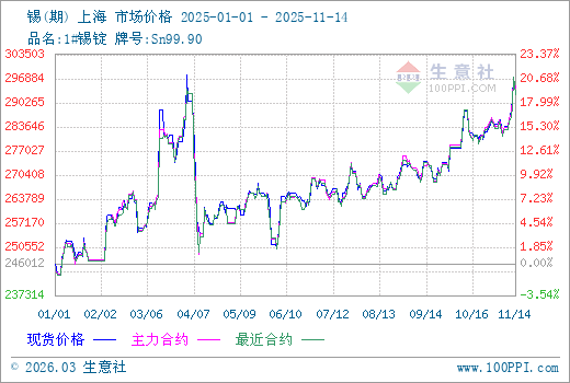 據(jù)生意社商品行情分析系統(tǒng)監(jiān)測:本周(11.10-11.14)華東地區(qū)1#錫錠市場波動(dòng)上漲,周初市場均價(jià)在286030元/噸,周末市場均價(jià)在292750元/噸,周漲幅2.35%。
