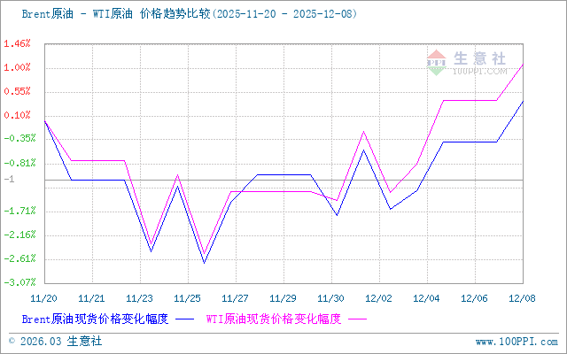 進(jìn)入本輪計(jì)價(jià)周期,國(guó)際油價(jià)行情低位震蕩,截止5日,美國(guó)WTI原油期貨1月合約結(jié)算價(jià)報(bào)60.08美元/桶,布倫特原油期貨2月合約結(jié)算價(jià)報(bào)63.75美元/桶。本輪調(diào)價(jià)周期內(nèi),原油價(jià)格行情先跌后漲,本周期初地區(qū)局勢(shì)有所緩和,加之美國(guó)需求減弱,美國(guó)關(guān)稅問(wèn)題拖累全球經(jīng)濟(jì)和需求預(yù)期,導(dǎo)致國(guó)際油價(jià)行情低位,后期歐佩克+產(chǎn)油國(guó)暫緩增產(chǎn),加之地緣和平協(xié)議達(dá)成渺茫,地緣因素致使原油走勢(shì)上漲。截止8日,第十個(gè)工作日原油品種變化率為-1.20%,對(duì)應(yīng)國(guó)內(nèi)油價(jià)每噸汽油下調(diào)55元,每噸柴油下調(diào)55元,折合每升下調(diào)89#0.04元、92#0.04元、95#0.04元、0#0.05元。