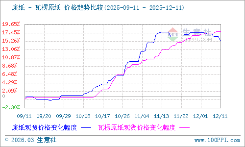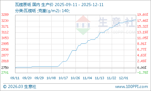 據(jù)生意社商品行情分析系統(tǒng)監(jiān)測:本周瓦楞紙價格大穩(wěn)小動,價格稍有上浮。2025年12月11日瓦楞原紙140g出廠價格均價為3240元/噸,與12月7日均價相比上漲了0.31%。