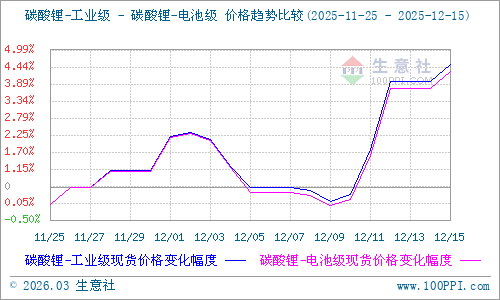 據(jù)生意社商品行情分析系統(tǒng)顯示:近期碳酸鋰價格持續(xù)上漲,截至12月15日,生意社電池級碳酸鋰基準(zhǔn)價96233元/噸,較上周同期(12月8日)上漲4%,環(huán)比上漲12.29%,同比上漲19.69%;工業(yè)級碳酸鋰基準(zhǔn)價94533元/噸,較上周同期上漲4.07%,環(huán)比上漲12.63%,同比上漲21.2%。