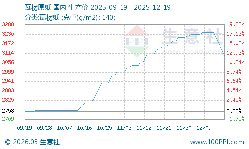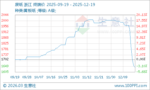 據(jù)生意社商品行情分析系統(tǒng)監(jiān)測(cè):本周廢紙價(jià)格可謂是跌跌不休,瓦楞紙也聯(lián)動(dòng)跟隨下行。2025年12月19日浙江地區(qū)廢黃板紙A級(jí)收購(gòu)價(jià)格均價(jià)為1642元/噸,與12月14日均價(jià)相比下降了16.48%。12月19日瓦楞原紙140g出廠(chǎng)價(jià)格均價(jià)為3100元/噸,與12月14日均價(jià)相比下降了4.32%。