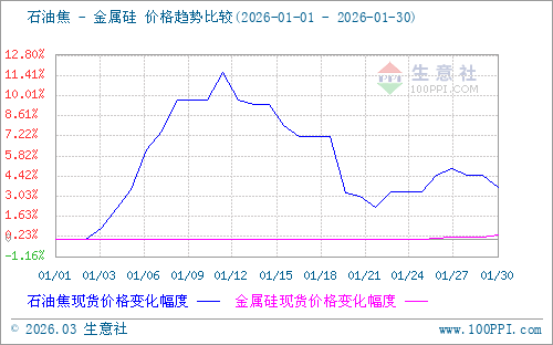 需求端:根據(jù)生意社行情監(jiān)測系統(tǒng)分析顯示,1月國內(nèi)金屬硅行情小幅上漲,1月30日為9650元/噸,較1月1日為9620元/噸,整體上漲0.31%。部分地區(qū)工業(yè)硅大廠仍有繼續(xù)減產(chǎn)檢修計(jì)劃,市場整體開工仍有下調(diào),金屬硅市場整體供應(yīng)壓力不大,工廠未有明顯去庫計(jì)劃。硅行業(yè)對石油焦市場需求仍存。