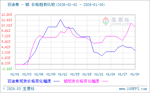 1月鋁價(jià)表現(xiàn)依舊強(qiáng)勁。據(jù)生意社商品行情分析系統(tǒng),截止2026年1月30日國內(nèi)鋁錠華東市場均價(jià)24666.67元/噸,較1月1日市場均價(jià)22473.33元/噸,上漲9.76%。春節(jié)前下游加工企業(yè)陸續(xù)放假,傳統(tǒng)消費(fèi)淡季疊加高價(jià)抑制采購意愿,鋁錠社庫持續(xù)累積(截至1月28日國內(nèi)社庫約79.6萬噸,較上周累庫2.8萬噸,接近 80萬噸,高于去年同期),現(xiàn)貨對期貨合約貼水走闊,凸顯下游觀望情緒。下游鋁用碳素對石油焦市場剛需為主。