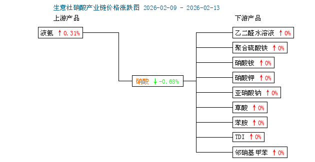 2.09-2.13期間上游液氨價格上漲0.31%,下游苯胺、硝酸鉀、硝酸銨、TDI價格均穩(wěn)定。下游市場染料、軍工、染料中間體等剛需跟進乏力 。隨著春節(jié)臨近,終端工廠備貨基本結(jié)束,交投氛圍日益清淡,生意社硝酸分析師預計硝酸價格或?qū)⒁哉鹗幤踝邉轂橹鳌?/p>