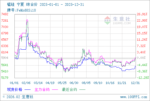 2025年硅鐵(牌號FeSi75-B,自然塊)寧夏混合價呈現(xiàn)“階梯式下行、整體疲弱、年末微弱企穩(wěn)”的走勢,全年價格從年初的6024元/噸震蕩回落至年末的5285元/噸,累計(jì)跌幅達(dá)12.26%,其間雖有短暫波動,但整體趨勢向下,市場承壓明顯。