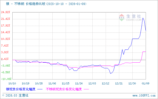 據(jù)生意社價(jià)差分析工具顯示,鎳和不銹鋼價(jià)格走勢(shì)相似,近期整體走勢(shì)大幅上漲。