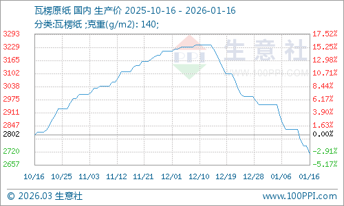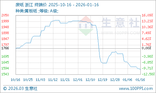 據(jù)生意社商品行情分析系統(tǒng)監(jiān)測:一月上旬廢紙和瓦楞紙價格均呈現(xiàn)跌跌不休之勢。2026年1月16日浙江地區(qū)廢黃板紙A級收購均價為1586元/噸,與1月1日均價相比下降了7.79%。瓦楞原紙140g出廠均價為2710元/噸,與1月1日均價相比下降了8.14%。