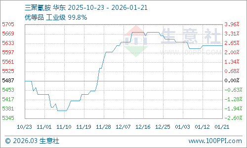 進(jìn)入2026年1月以來(lái),國(guó)內(nèi)三聚氰胺市場(chǎng)延續(xù)了去年末的平穩(wěn)格局,價(jià)格呈現(xiàn)典型的“高價(jià)位、低波動(dòng)”特征。根據(jù)價(jià)格追蹤數(shù)據(jù)顯示,自2025年12月底至2026年1月21日,工業(yè)級(jí)(優(yōu)等品)主流市場(chǎng)價(jià)格始終在5633-5666元/噸的狹窄區(qū)間內(nèi)運(yùn)行,特別是自1月3日?qǐng)?bào)5633元/噸后,價(jià)格已連續(xù)三周維持在該水平線上,市場(chǎng)表現(xiàn)出極強(qiáng)的穩(wěn)定性。